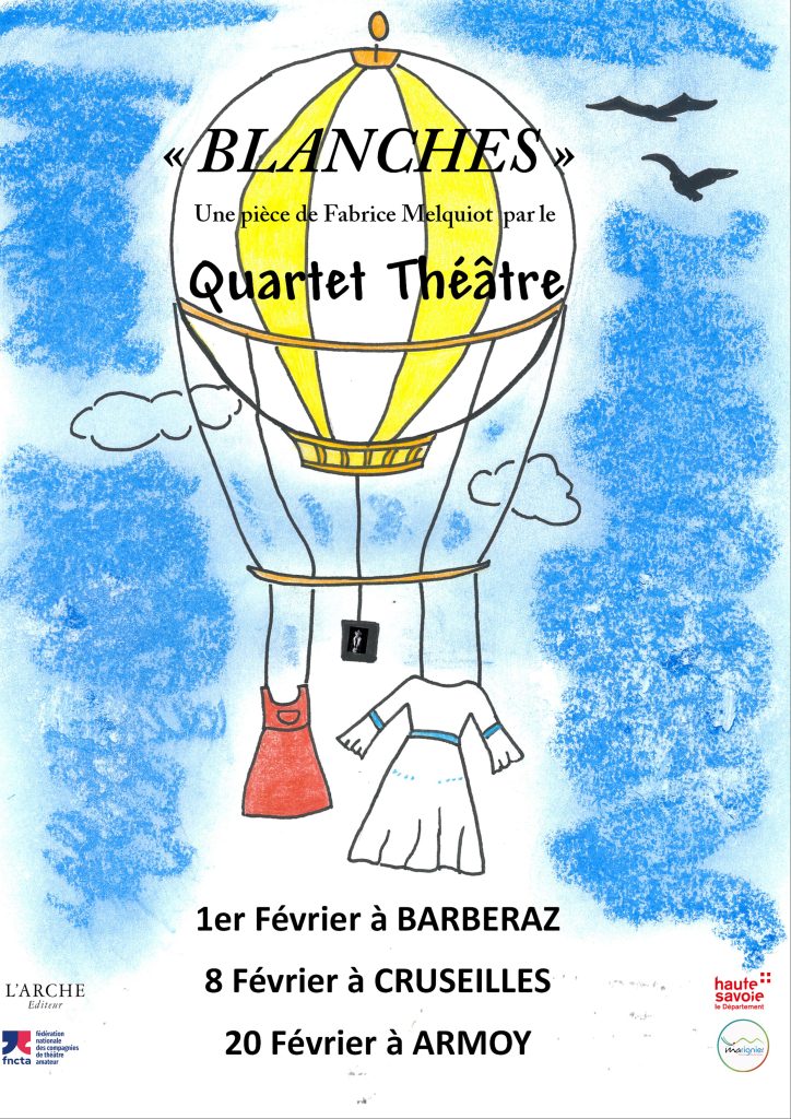 La troupe du Quartet Théâtre aura le plaisir de se produire avec la pièce « BLANCHES » de Fabrice Melquiot lors du festival de théâtre amateur de BARBERAZ(73) le 1er Février à 11h.
